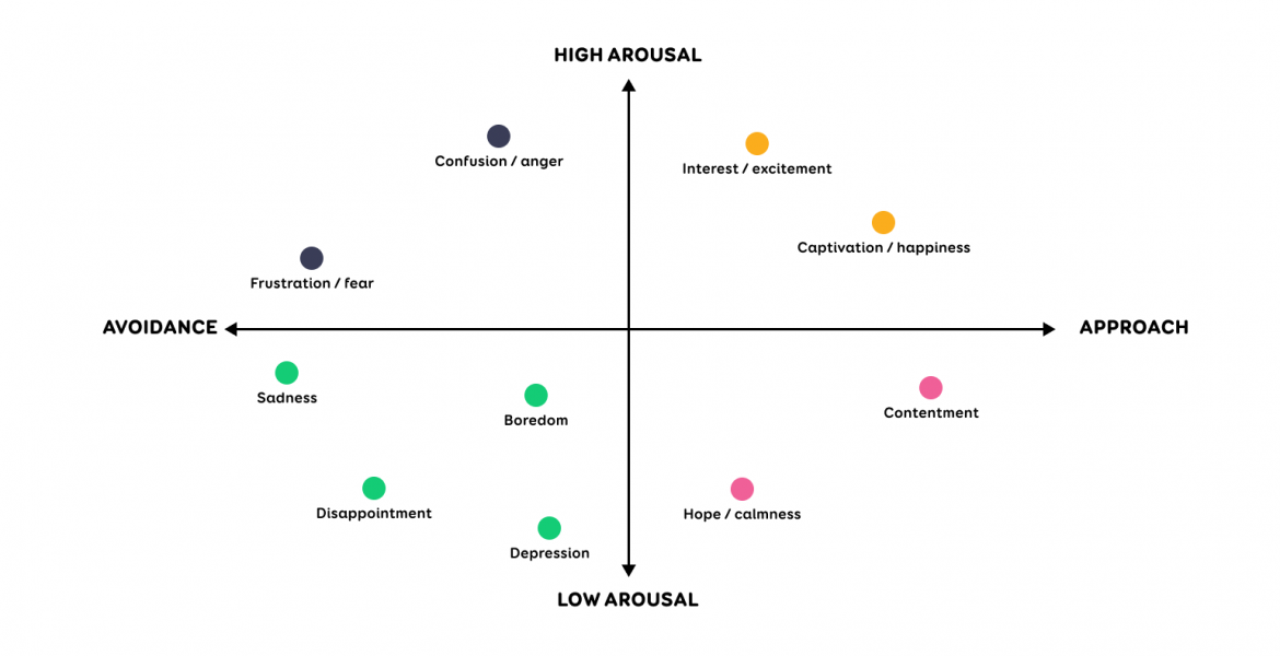 For example, when testing product packaging design, a user interface or a commercial clip, then we are aiming for a result in the upper right quadrant, which shows “a high level of arousal + approach”. There, the user’s interest AKA arousal towards the product is high and is thus very likely to motivate the user to do something for it (e.g., purchase the product or click the button).
